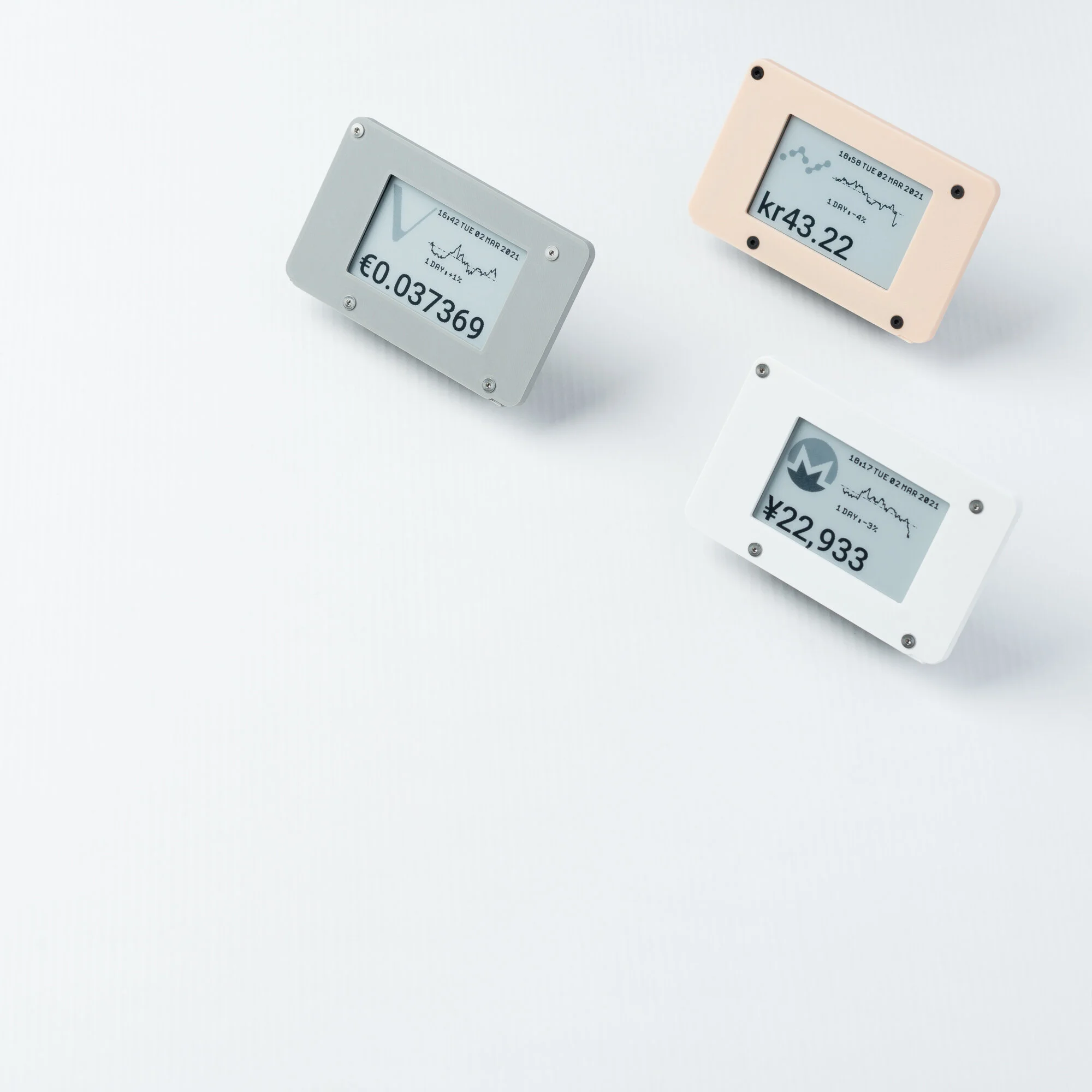 Cryptocurrency TickerThis is our OG ticker. It can track any of the 6000+ coins on Coingecko. It has an e-ink screen, so that you can steal a cheeky glance from any angle. Get one